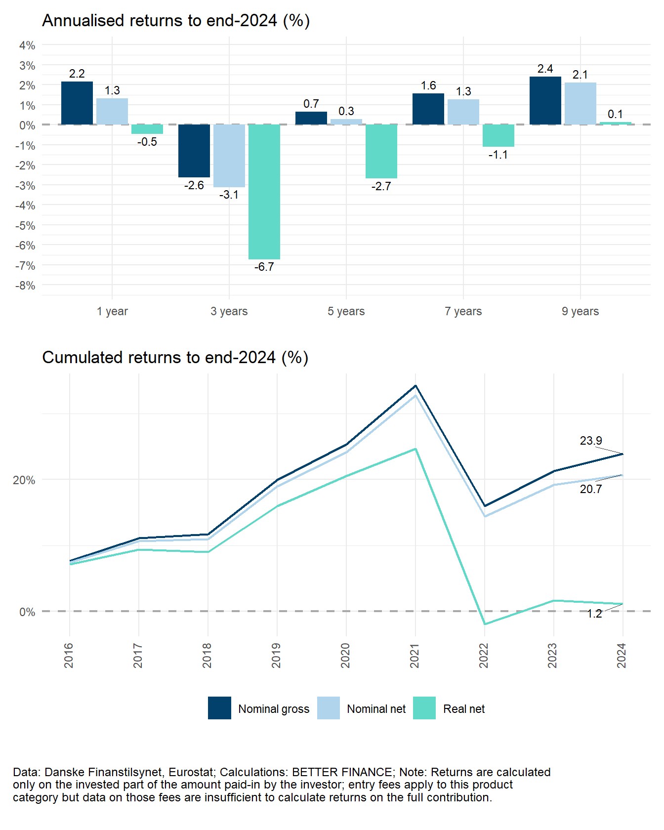 Finally, and although they represent a mere 1% of total Danish pension savings, we compute the returns of company pension funds, displayed in Figure 8.8. Even though more data is available, for this edition, we could only compile the data for the years 2016-2024, which show a pattern similar to those of industry-wide pension funds and life insurance: over the eight years, costs have a limited impact on performance (-0.2 p.p. annually, -2.1 p.p.s), while inflation virtually wipes away all performance (-2 p.p.s annually, -17.5 p.p.s cumulated), leaving members of those funds with a meagre +1.7% real net return.