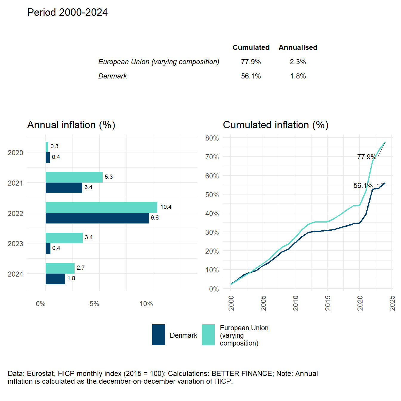 Second, we adjust these nominal net returns for inflation, thereby obtaining real net returns. The inflation rates we use for this are based on Eurostat’s harmonised index of consumer prices (HICP) index for Denmark, as per the methodology explained in the introductory chapter. As can be observed in Figure 8.5, Denmark ranks below the European Union (EU) average in terms of inflation, with an annualised inflation rate of 1.8% over the period 2000-2023, which amounts to a cumulative inflation of 53.34% over the same period, compared to 73.23% for the EU.