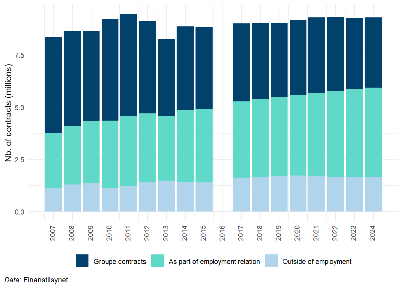 In 2000, around 1064 thousand people contributed to one or more individually subscribed pension schemes. The number declined steadily until 2013 (to about 571 thousand), before increasing again to around 676 thousand in 2021. The sharp fall in 2013 mainly reflects the transition from kapitalpension to alderopsparing. It likely took time for savers to familiarise themselves with the new scheme, and the introduction of a contribution cap on ratepension in 2012 also contributed to the decline. Since then, participation has fluctuated somewhat. A notable drop between 2018 and 2019 appears mainly linked to tax-related changes, including the introduction of a contribution ceiling for ratepension and the conversion of some contracts into alderopsparing, rather than a real decline in interest in individual saving. By 2024, the number of contributors had returned to roughly the same level as in 2018.