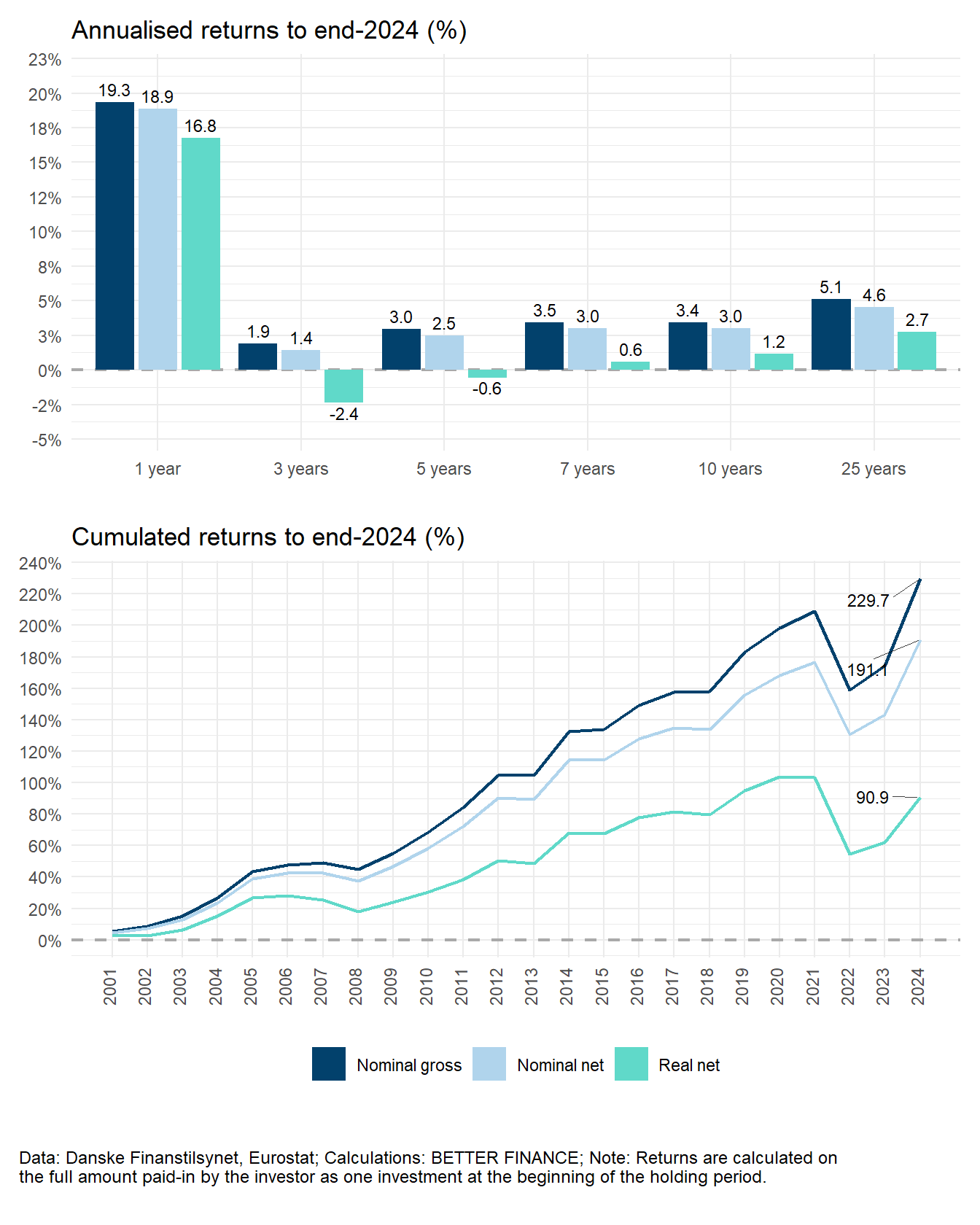 Figure 8.6 displays the returns of industry-wide pension funds over the period 2000–2024. As we can see, despite the market downturn in 2022, which resulted in losses in nominal terms (-7.6%), the recovery in 2023 (+10.3%) and the strong results of the previous years mean that for a holding period as short as 3 years, nominal annualised results are positive (+3.9%). The generally low fees levied by pension funds translate into nominal net returns that are very close to the nominal gross returns: As we can see, fees only reduce the annualised performance over 24 years by 0.2 percentage points (p.p.s), and the cumulated performance over the same period by only 11.8 p.p.s.