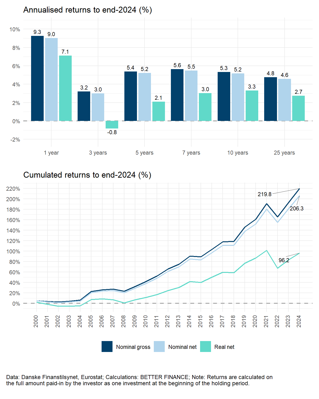Real net returns of Danish long-term and pension savings