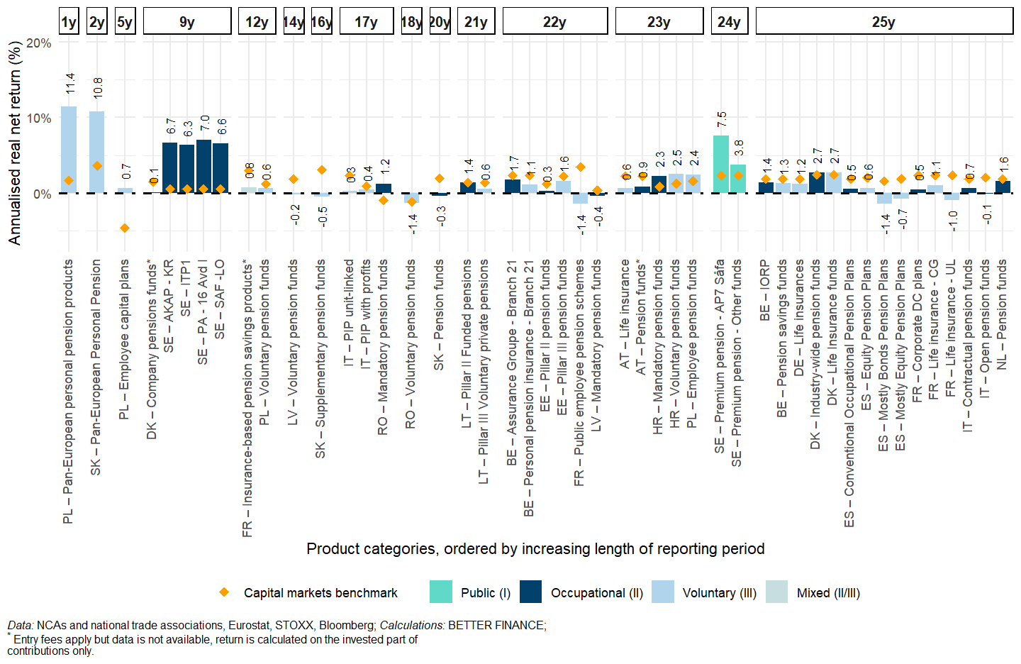 The contrast is stark with those products that display a negative cumulated real net return, like French unit-linked life insurance (-21.7% over 25 years) or French public employee pension schemes (-27% over 22 years)—Liberté, égalité, fraternité but in poverty—or Spanish “mostly bonds” individual pension plans (-29.5% over 25 years).